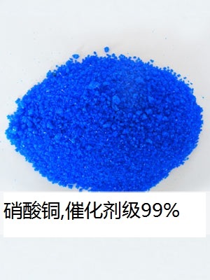 硝酸铜,三水Cupric nitrate ,trihydrate分子式:Cu(NO3)2·3H2O分子量:241.6性状:蓝色结晶体,易潮解。相对密度2.05,熔点114.5℃。加热到170℃时分解。溶于水及乙醇。水溶液呈弱酸性。 有氧化性。与可燃物质混合加热摩擦或撞击能引起燃烧或爆炸。燃烧时产生有毒、刺激性的氮氧化物。对皮肤有刺激性。用途:用作催化剂、氧化剂、荧光粉激活剂及光敏电阻材料等。